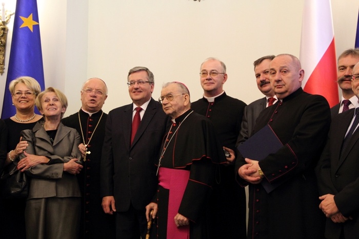 Prezydent Bronisław Komorowski wręcza rozporządzenie bp. Alojzemu Orszulikowi i wojewodzie łódzkiemu Jolancie Chełmińskiej