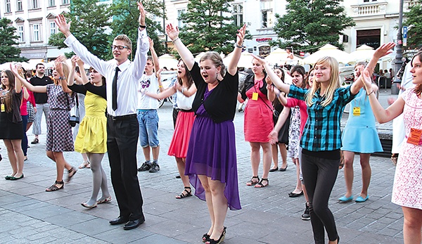 Gwarne późne popołudnie na krakowskim Rynku. Pełne ogródki restauracyjne, kolejne wycieczki uzbrojone w aparaty zmierzają w kierunku Sukiennic. I nagle do uszu przechodniów dobiega śpiew: „Pokój wam, nie bójcie się. Weźmijcie Ducha Świętego, On poprowadzi was”. To młodzież z archidiecezji katowickiej, która kończy rekolekcje III stopnia Oazy Nowego Życia. – Od pięciu lat zamiast celebrować agapę, idziemy na Rynek, do ludzi, by mówić im o Bogu. W tym roku będzie to po raz pierwszy zaplanowana akcja, ze scenariuszem. Mamy też baner, żeby każdy od razu wiedział, kim jesteśmy. Jest dziewczyna, która tłumaczy wszystko na angielski, bo Kraków to miasto turystów – tłumaczy ks. Jarosław Ogrodniczak, opiekun grupy.