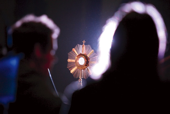Kolejny wieczór uwielbienia. Zakonnicy wnoszą obraz Jezusa Miłosiernego. Tematem homilii podczas Mszy św. poprzedzającej modlitewne spotkanie jest zaufanie. O. Krzysztof Michałowski OP mówi o św. Piotrze, który na słowa Jezusa zarzuca sieć w jezioro. – On musiał zobaczyć w Jezusie kogoś więcej niż syna cieśli. Kogoś, kto zna się na jego życiu bardziej niż on sam – tłumaczy Ewangelię o połowie ryb.