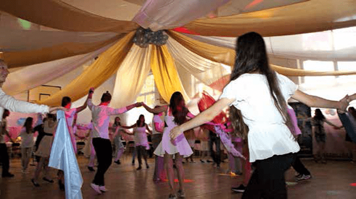 Marta Masternak z Domowego Kościoła pokazuje najpierw te najłatwiejsze kroki – do fragmentów utworu „Budki Suflera”. „Wszyscy święci balują w niebie, złoty sypie się kurz” – ręce lekko unoszą się do góry, jak ziarna złotego puchu. „A ja włóczę się znów bez Ciebie i do piekła mam tuż…” – tancerze cofają się i pochylają, jakby uderzeni. Czuć „powiew piekieł”. Ale już po chwili wirują z uniesionymi rękoma, a dziewczęta – z kolorowymi chustkami w dłoniach. Bo przecież „w niebie dzisiaj wszyscy, wszyscy święci mają bal”.
