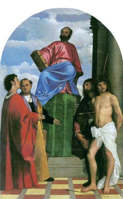 Wielki artysta namalował tych świętych, o których wstawiennictwo prosili wenecjanie. Zgodnie z intencją fundatorów, szczególnie uhonorował św. Marka. Posłużył się w tym celu sięgającym XIV wieku schematem kompozycyjnym, zwanym sacra conversazione (święta rozmowa). Były to przedstawienia Matki Bożej siedzącej na tronie, otoczonej świętymi. Tycjan zamiast Maryi umieścił na tronie Marka. Z lewej strony Ewangeliście towarzyszą Kosma i Damian, a z prawej – Roch i Sebastian. Strzała wbita w bok Sebastiana, przypominająca o jego męczeńskiej śmierci, jest tylko atrybutem świętego, czyli wyróżnikiem pozwalającym go rozpoznać. Nie pełni żadnej innej roli w kompozycji.