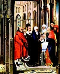 Hans Memling, „Ofiarowanie w świątyni” olej na desce, 1463, National Gallery of Art, Waszyngton.
