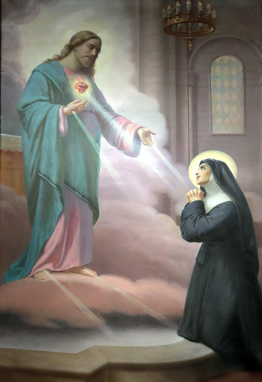 Dwa lata po otrzymaniu habitu zakonnego, w 1673 roku, kiedy siostra Małgorzata w chórze klasztornym adorowała Najświętszy Sakrament, Jezus objawił jej się po raz pierwszy. Otworzył swoją pierś i powiedział: „Moje Boskie Serce płonie tak silną miłością ku ludziom, że nie może dłużej utrzymać tych gorących płomieni, zamkniętych w moim łonie. Ono pragnie je rozlać za twoim pośrednictwem i pragnie wzbogacić ludzi swoimi skarbami”. Podczas tego objawienia Jezus wziął serce Małgorzaty i umieścił je symbolicznie w swoim Sercu, a następnie oddał jej serce gorące.