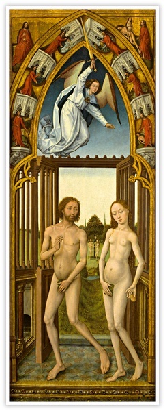 Ewa trzyma jeszcze w ręce nadgryzione jabłko, zerwane wbrew woli Boga. Pierwszych rodziców pogania wzniesionym mieczem widoczny u góry anioł w białej szacie. Wkrótce zamkną się za nim kraty bramy.