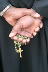 Dziś wszędzie tłoczno, przysiadłem więc w zakrystii, blisko drzwi do kaplicy. Czy można bliżej? Różaniec w garści, modlę się. Dookoła cały czas coś się dzieje. Moja obecność niczego nie zakłóca. W głębi zakrystii dyżurni bracia zapisują Msze święte. Widzę tam i moich parafian. Tu znowu diakon poświęca różańce, obrazki, medaliki. Ze swadą odmawia modlitwę i z dużą wprawą macha kropidłem, ma chłopak styl. W końcu on to robi ileś razy dziennie. Za mną cały kąt zastawiony plecakami. Dużo ich jest.