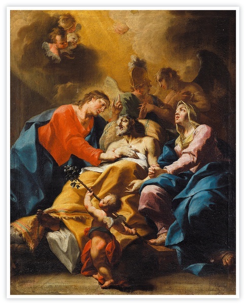 Niczego nie wiemy o okolicznościach śmierci św. Józefa. W Piśmie Świętym nie ma o tym najmniejszej wzmianki. Mimo to artyści, zwłaszcza w epoce baroku, chętnie sięgali po ten temat, wiedząc, że musiało to być wstrząsające przeżycie dla Jezusa i Jego Matki.
