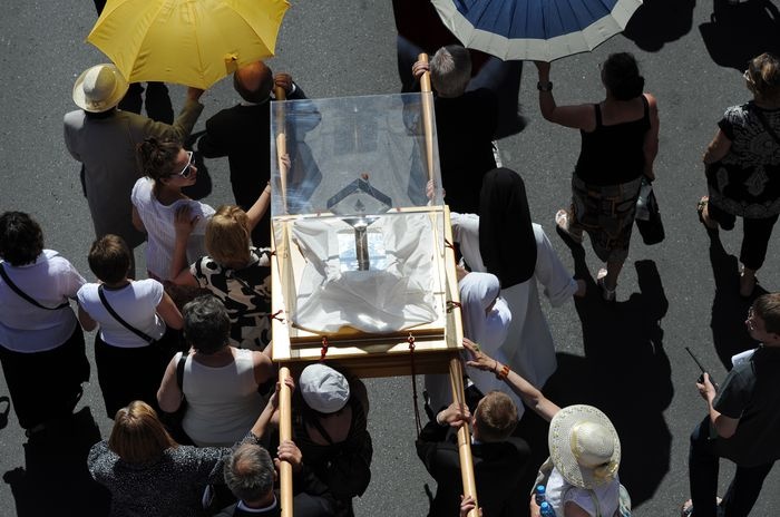 Relikwie Jana Pawła II zostały przyniesione w niedzielę do Wilanowa w uroczystej procesji, która z pl. Piłsudskiego wiodła Traktem Królewskim do Pól Wilanowskich. Na poszczególnych odcinkach relikwie niesione były przez przedstawicieli różnych środowisk. Na trasie do procesji dołączyli prezydenci i burmistrzowie miast papieskich z całej Polski.