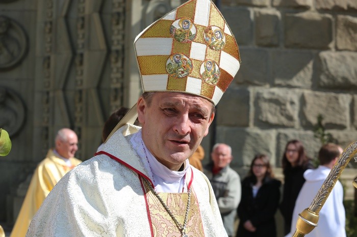 Bp Roman Pindel podczas Eucharystii w czasie Kalwaryjskiego Dnia Młodych w Kalwarii Zebrzydowskiej.