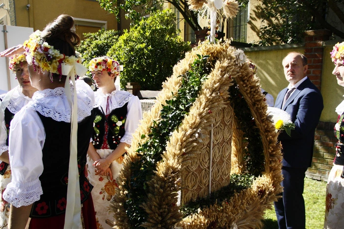 Przed zakończeniem Eucharystii kard. Ryś pobłogosławił i poświęcił wieńce dożynkowe, dziękując wraz z rolnikami za tegoroczne plony, będące owocem ziemi i pracy rąk ludzkich. Duchowny przypomniał, że chleb i wino, które składane są na ołtarzu podczas każdej Mszy świętej i ofiarowane Bogu, mamy dzięki ofiarnej pracy rolników, za którą dziś dziękujemy.